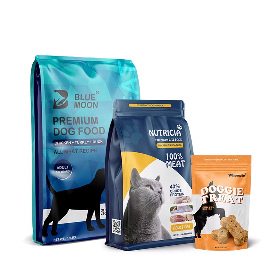 Long shelf life standing pouch mylar bag Vietnam flat bottom plastic dog cat food packaging wholesale OEM airtight seal