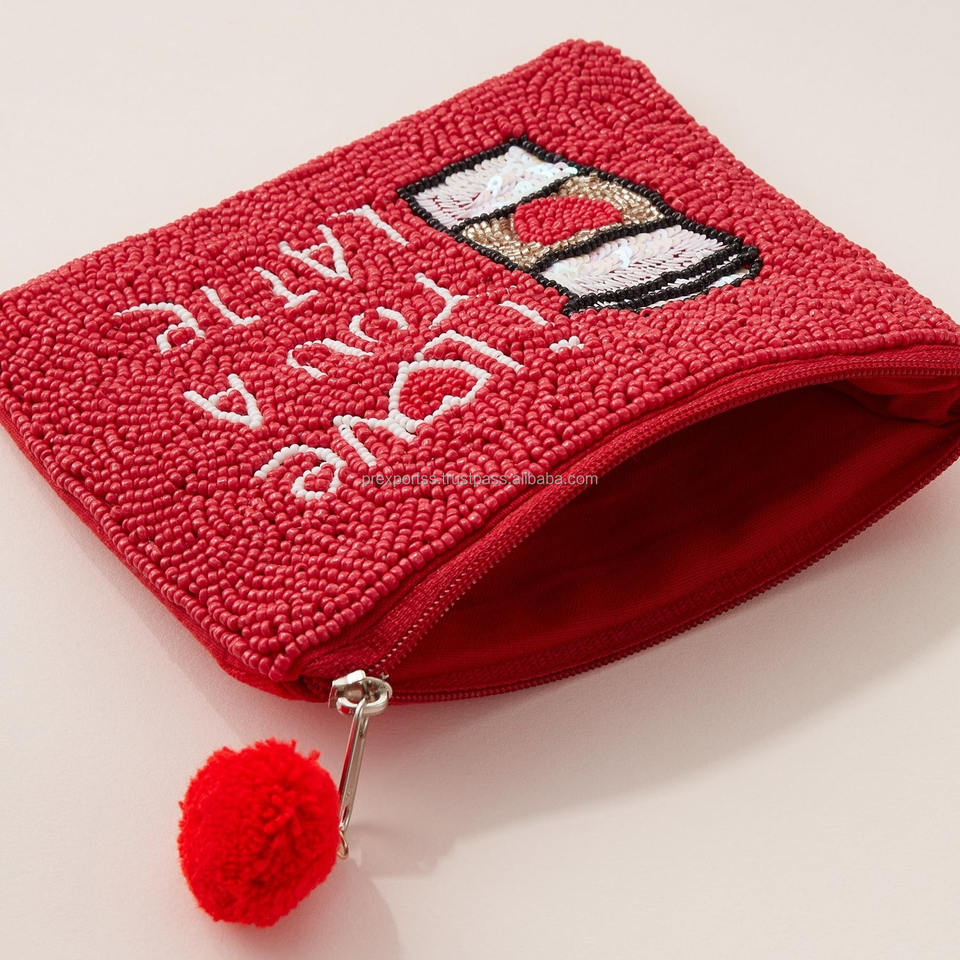Love You Latte Beaded Coin Purse Valentine Coffee Design Red Sequin Mini Magnetic Foldable Clutch Bag Handmade Romantic Gift Her