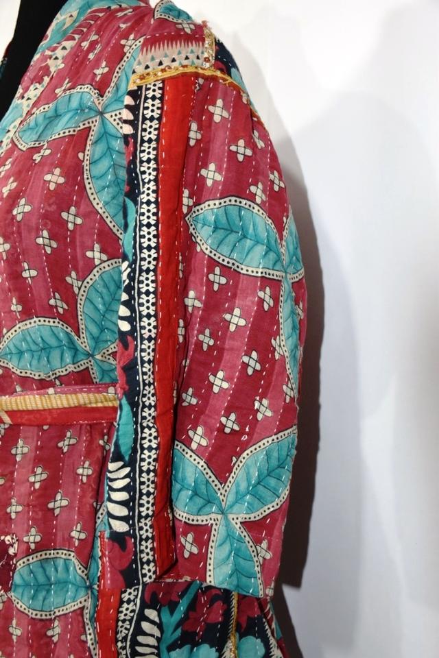 Lovely Rose Color Quilted Kantha Jacket Free Size Adjustable Breathable Knee Length Short Kimono Robe with Adjustable Belt
