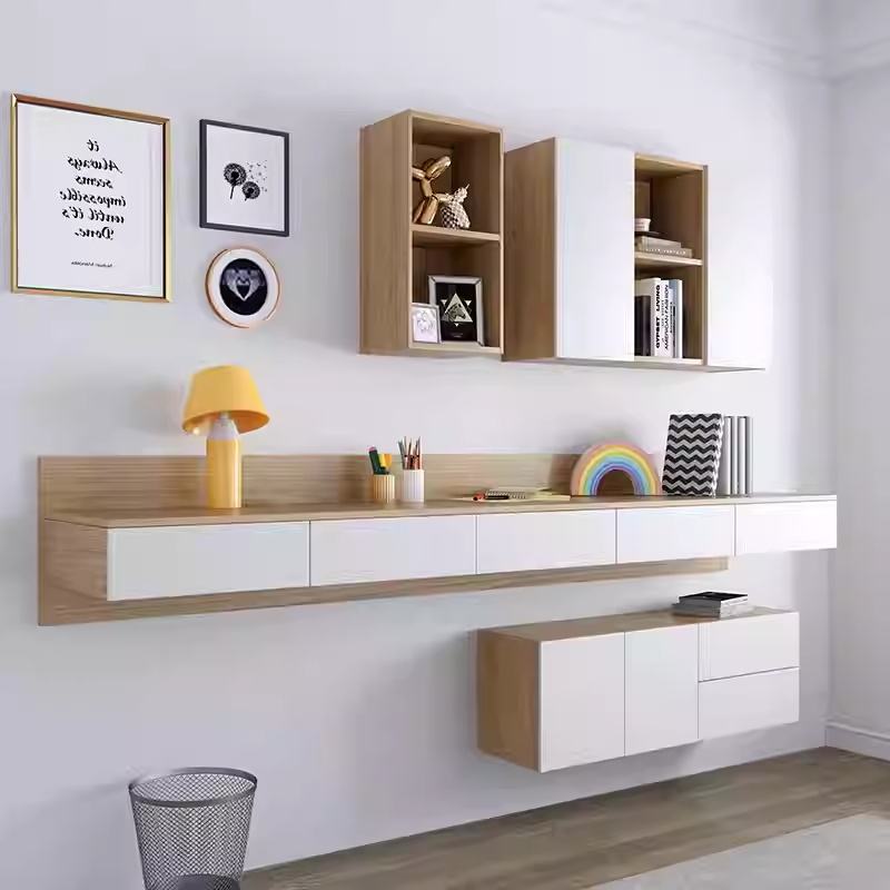 Low-Cost Space-Saving Modern Apartment Bedroom Furniture Set Durable Wooden Bed Wardrobe Nightstand and Wall-Mounted Desk