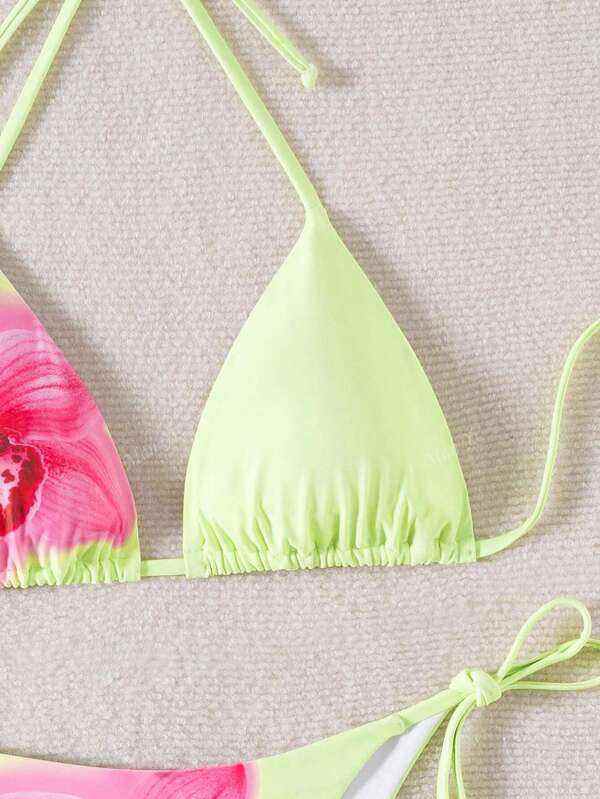 Low MOQ Custom Designed Active Two-Piece Ladies Bikini Set Light Green Floral Orchid Print Breathable Polyester High Beachwear