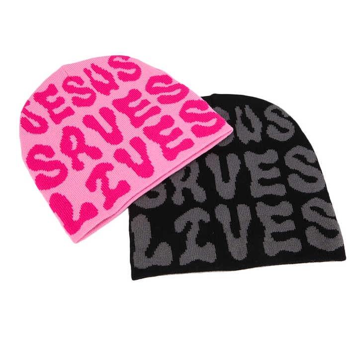Low Moq Custom Beanie Manufacturers All Over Print Jacquard Gothic No Cuff Fold Cuffless Winter Skull Cap Knit Hat With Logo