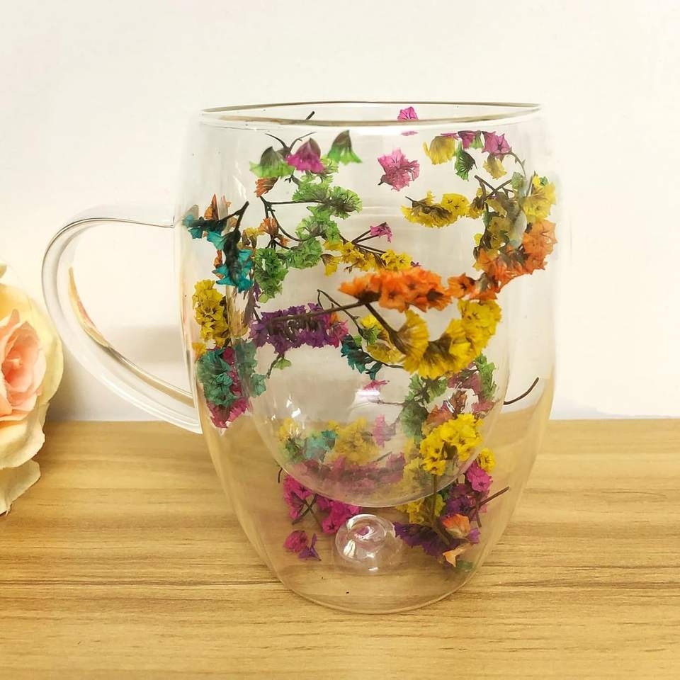 Low Moq Handmade High Borosilicate Double Wall Glass Mug Cup with Dry Flower