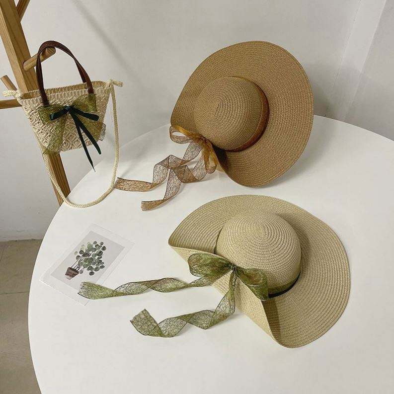 Low Moq Handmade Large Bowknot Ribbon Straw Hat Bag Set Large Brim Beach Vacation Sun Hat for Women