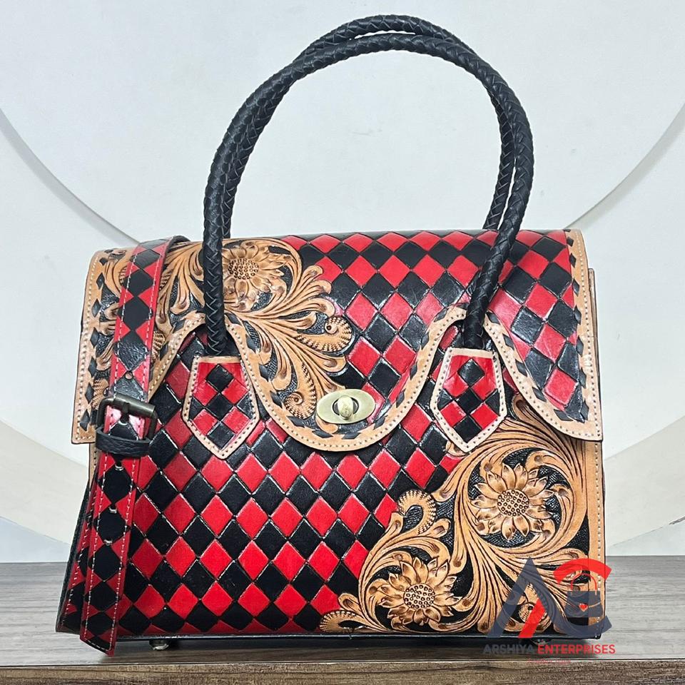 Low Price Hand Tooled Cowhide Leather Tote Bag with Checkered Pattern Western Handbag Stylish Women's Fashion Crossbody Purse