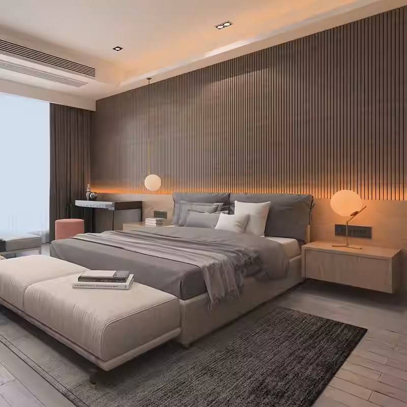 Low-Priced Modern Hotel Bedroom Furniture Set Wooden Frame Platform Bed Upholstered Headboard Nightstand Ottoman Desk Water
