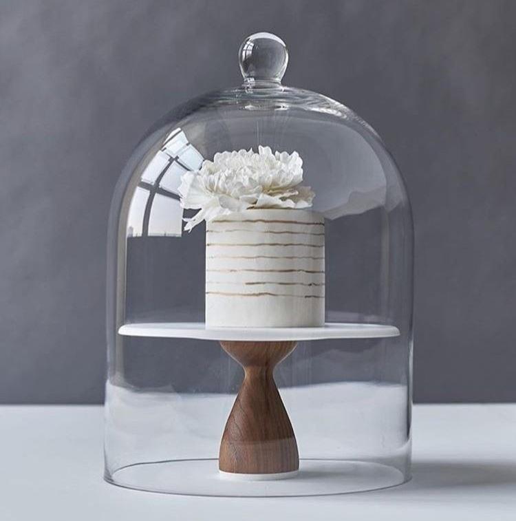 Low profile glass cake dome with wooden feet base modern dessert cover display for kitchen counter table low height simple look