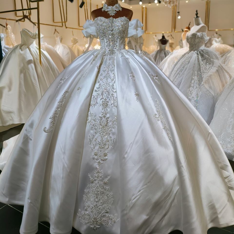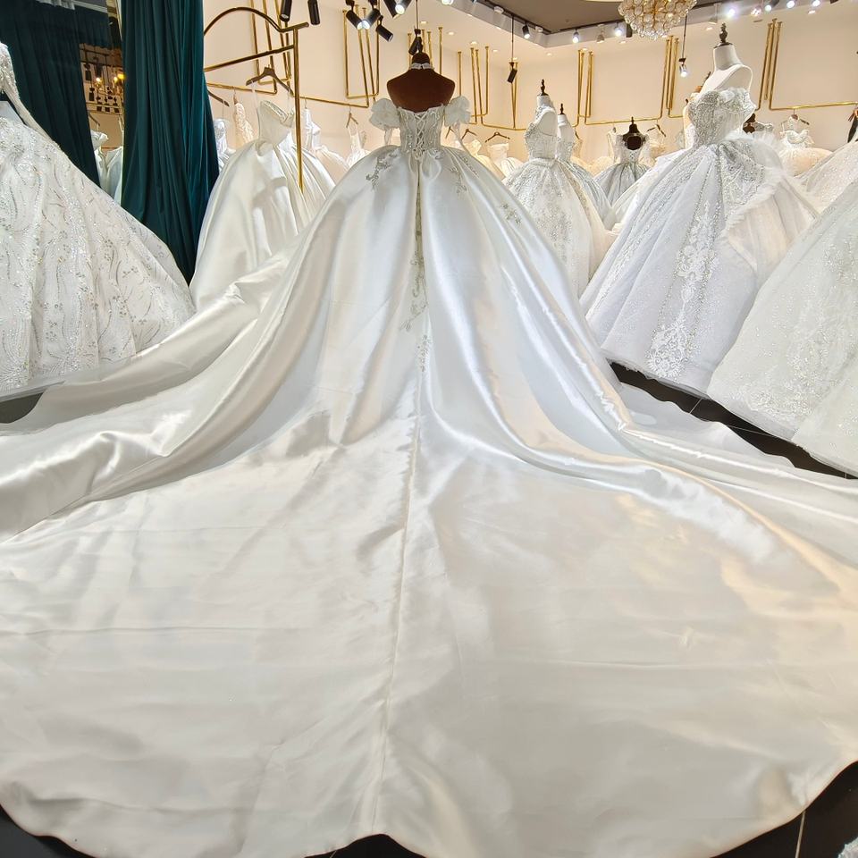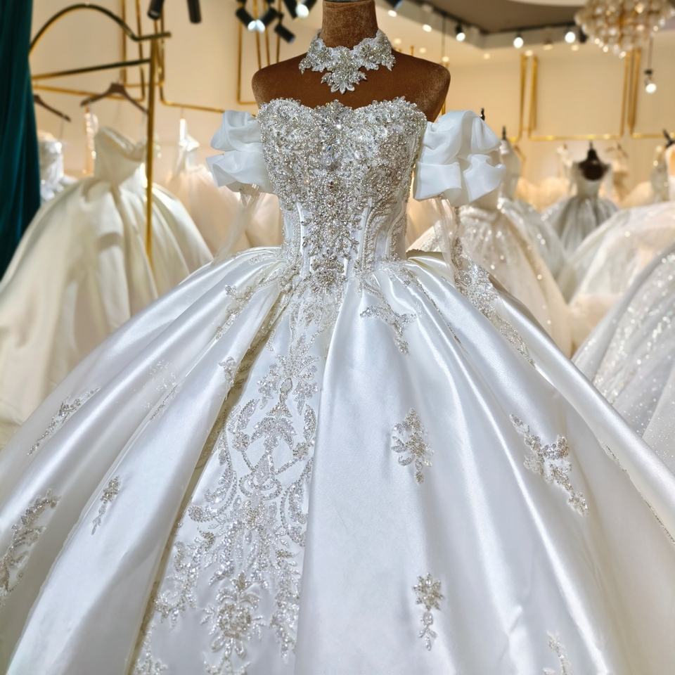 Lsml037 Modern Wedding Dress Bridal Ball Gowns Satin Chapel Train V-neck Princess Appliques Rhinestone Decorations for