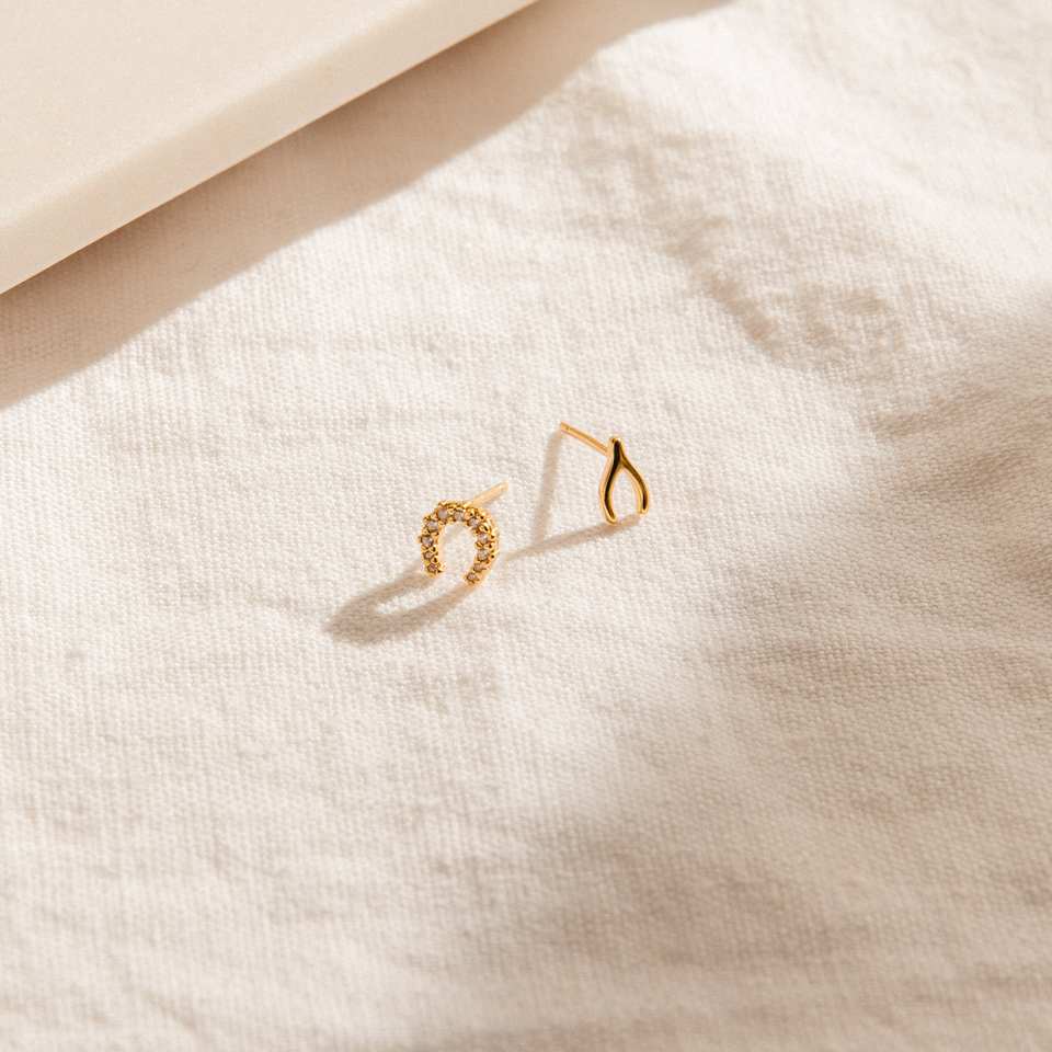 Lucky Mismatched Stud Earrings 925 Silver Gold Plated Dainty Wishbone and Diamond Horseshoe Earrings Perfect Best Friend Gift