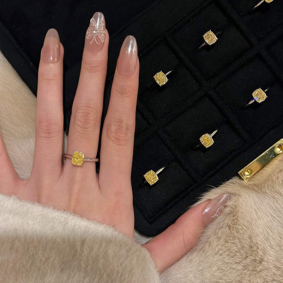 Lucky Yellow Diamond Ring Necklace Pillow Cut S925 Pure Silver with High Carbon Diamond Rich Heirloom Diamond Collarbone Set