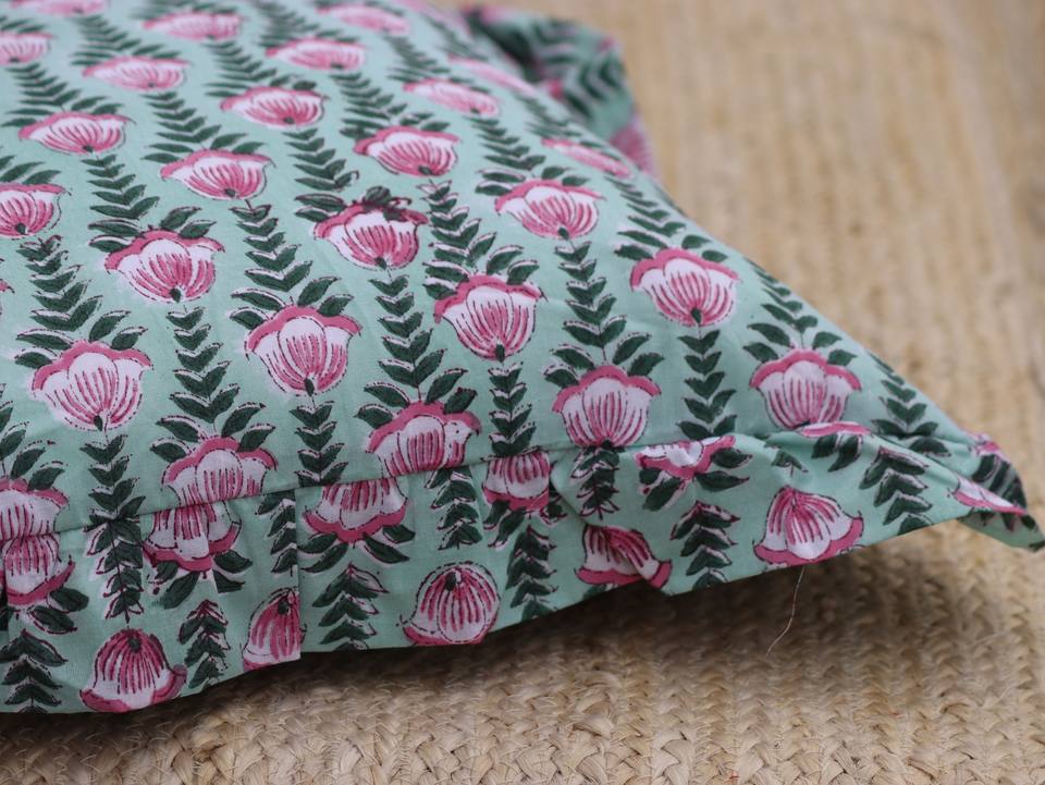 Lumbar Pillow Cover Floral Cotton Sham with Ruffle, Block Print Cushion for Back Support, Side Sleep