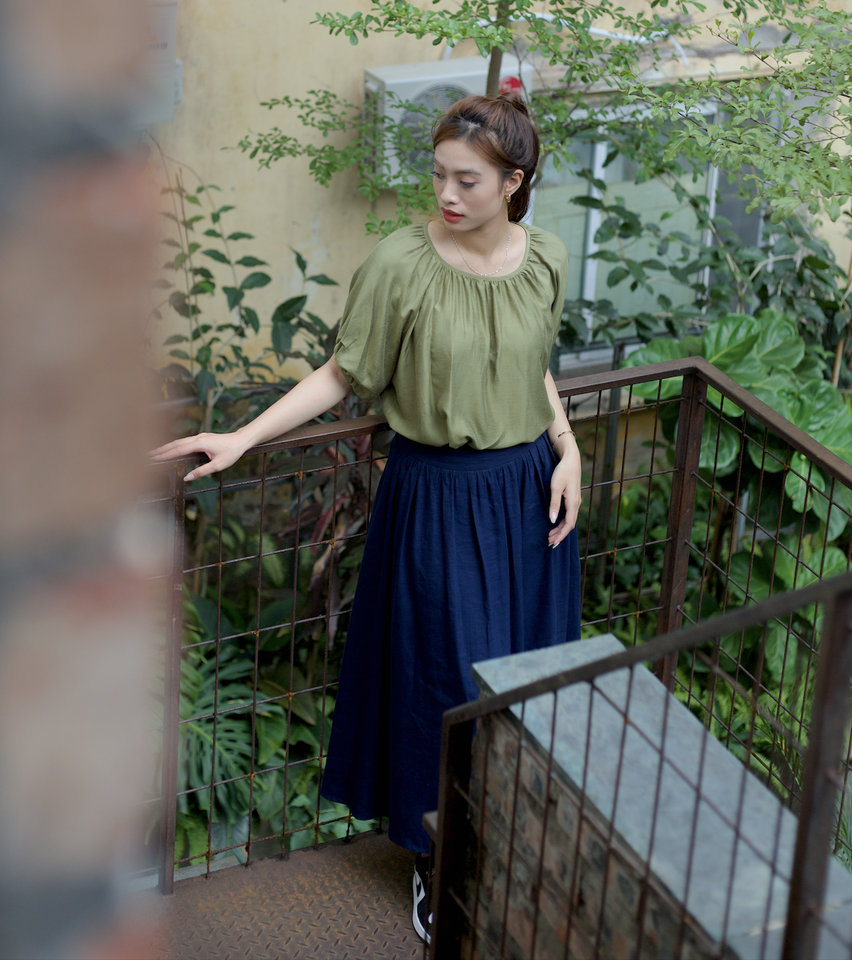 Luxe Casual Rayon Blouse with Billowy Short Sleeves & Button Neck Opening