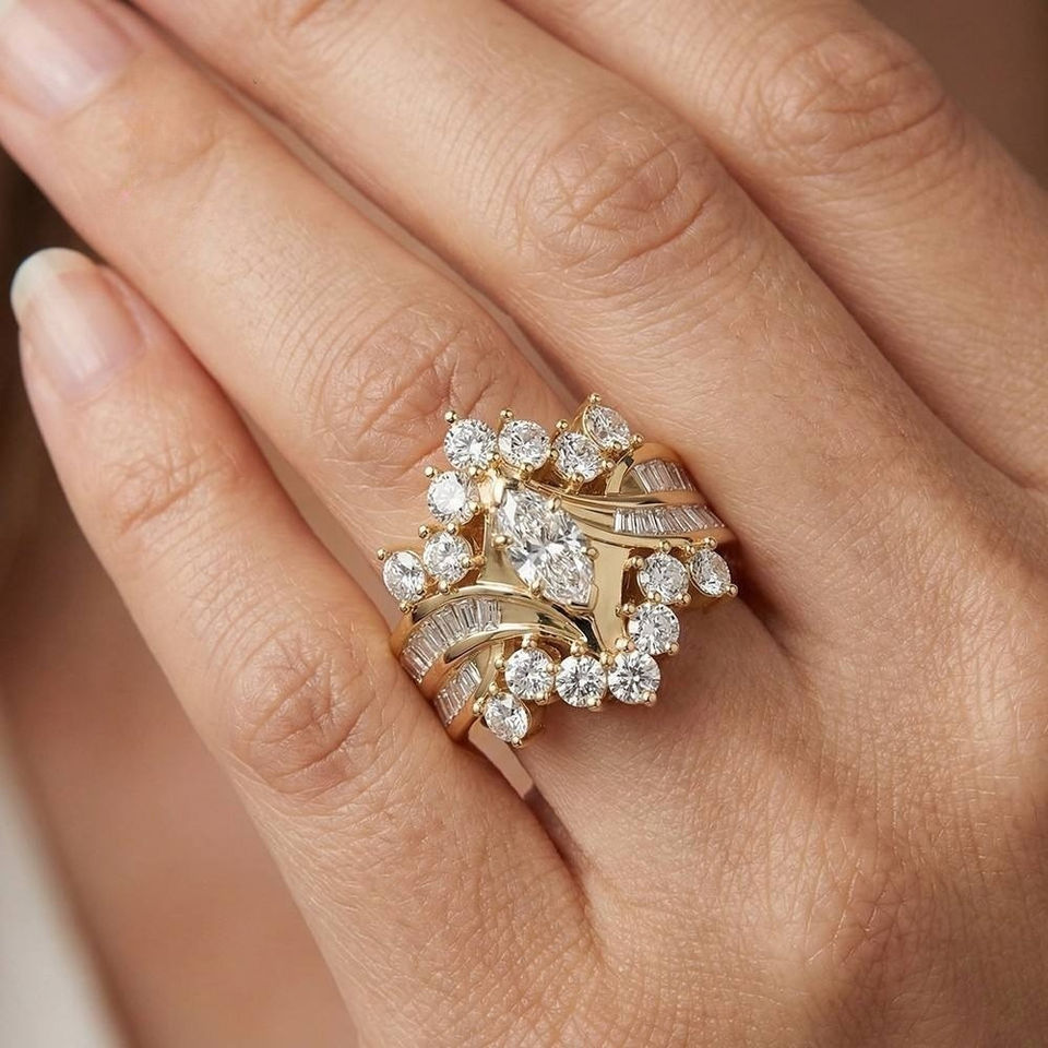 Product name:14K Gold Marquise & Baguette Cut Cluster Ring Bypass Diamond Ring