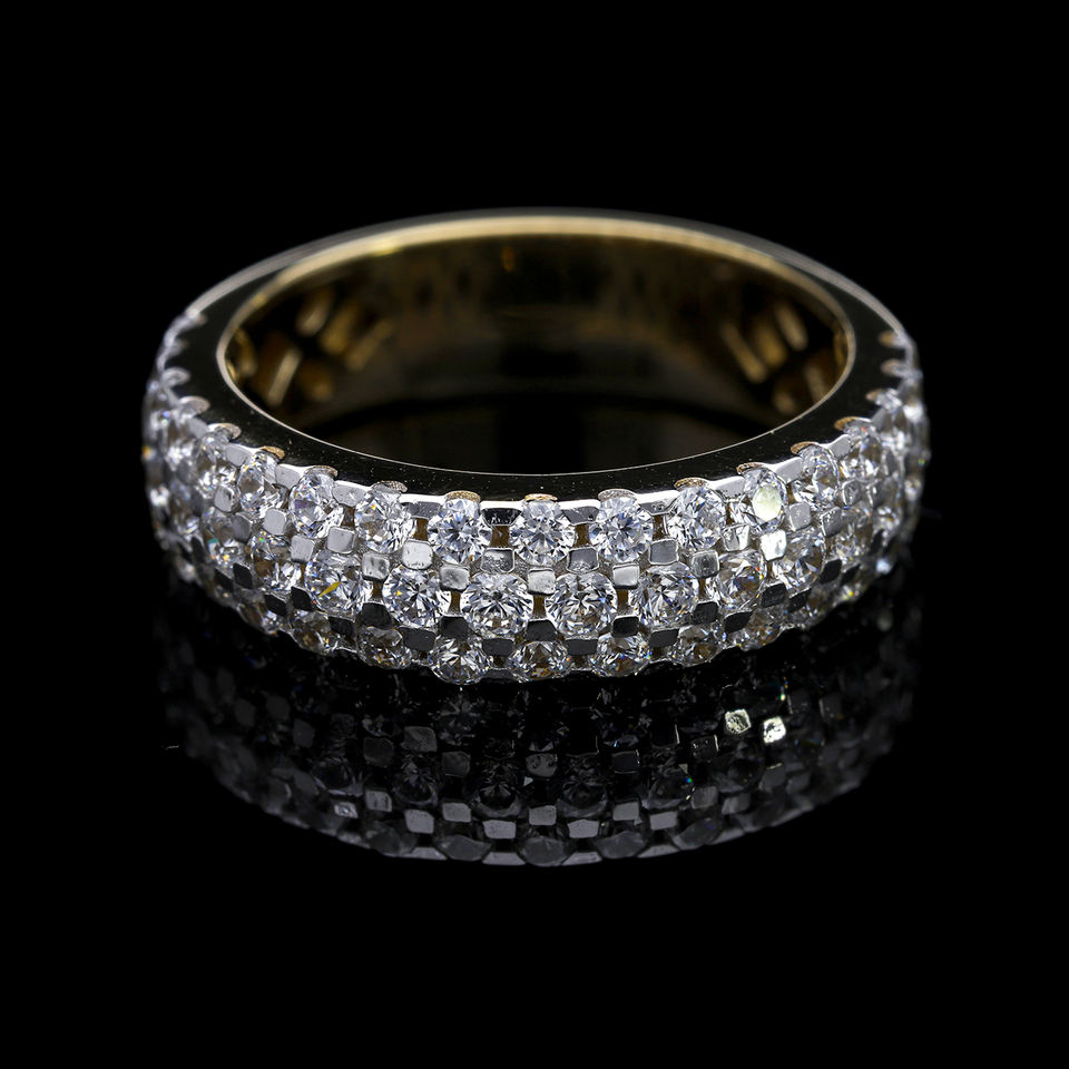 Luxurious 14K Yellow Gold Rhodium Plated Natural Diamond Ring Triple Row Pave Setting Brilliant Cut Bold Statement Band Womens