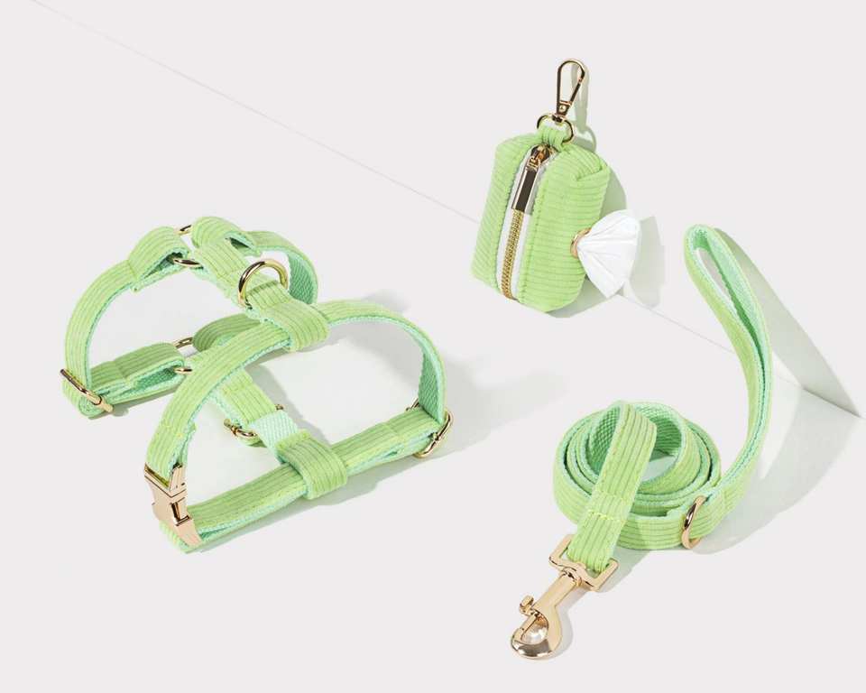Luxurious And Dispenser,Personalised Green Corduroy Puppy Leash Set,Soft Dog Collar Poo Bag Holder