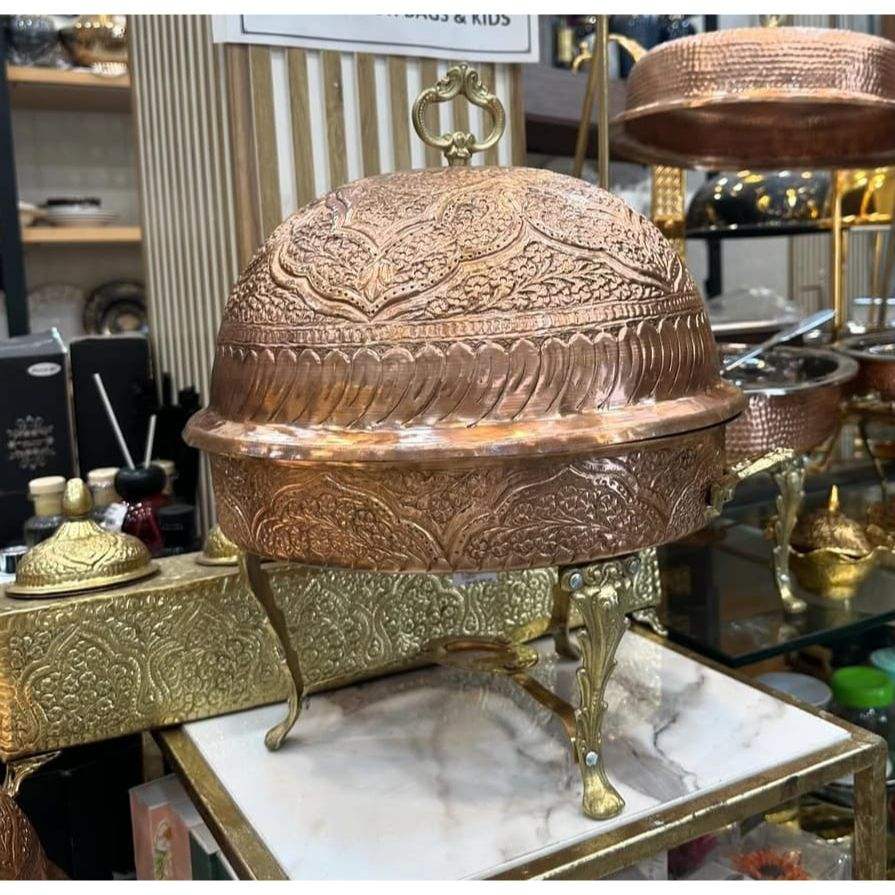 Luxurious Antique Copper Chafing Dish with Ornate Detailing Perfect for Event Dining and Food Presentation