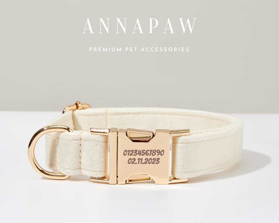 Luxurious Cream Velvet Set Handmade Puppy Wedding Gift with Custom Engraved Dog Collar Bowtie & Leash