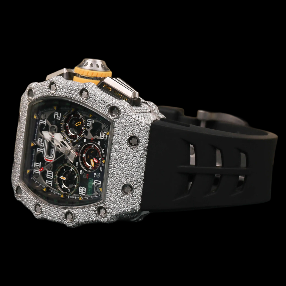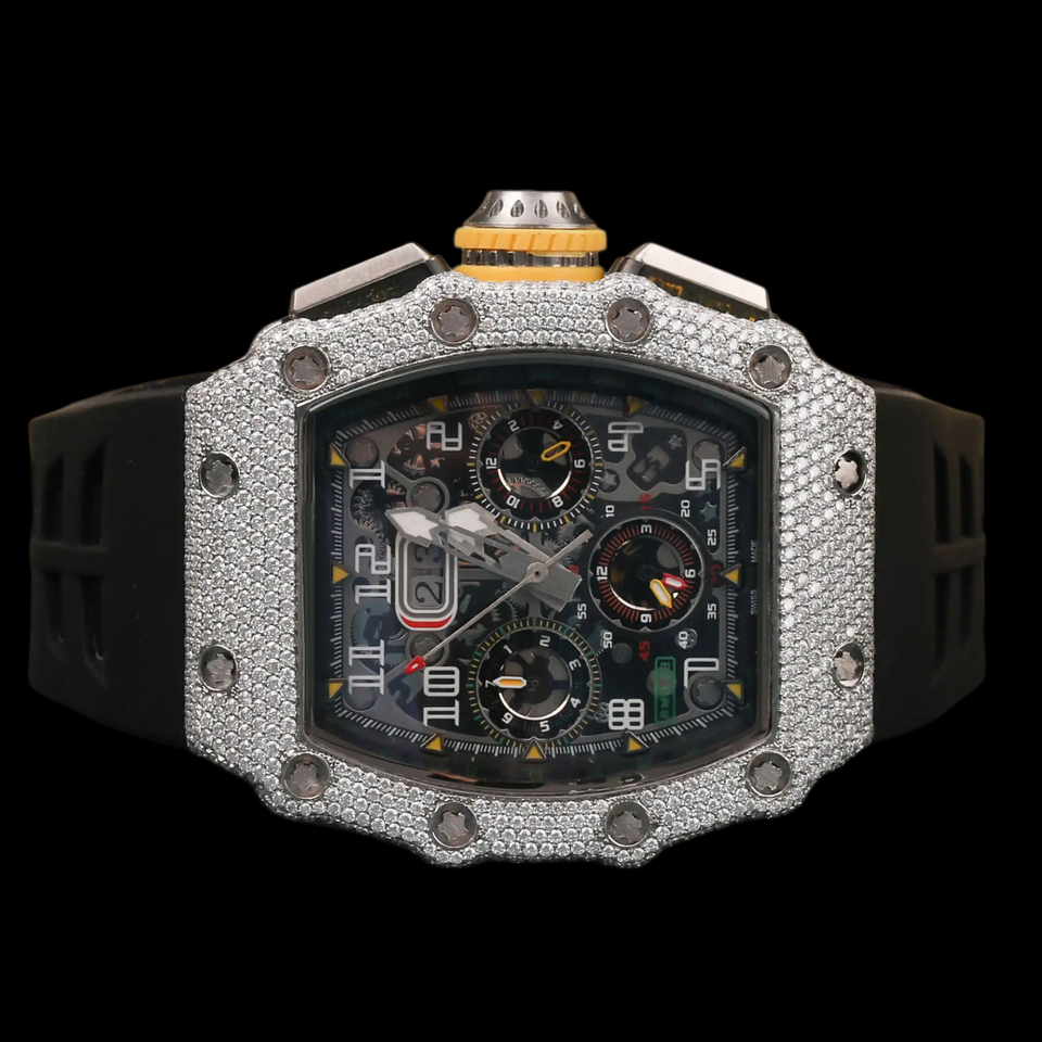 Luxurious Customized Chronograph Watch Black Rubber Strap Wrist Watch Rectangle Case Moissanite Diamond Gift for Him