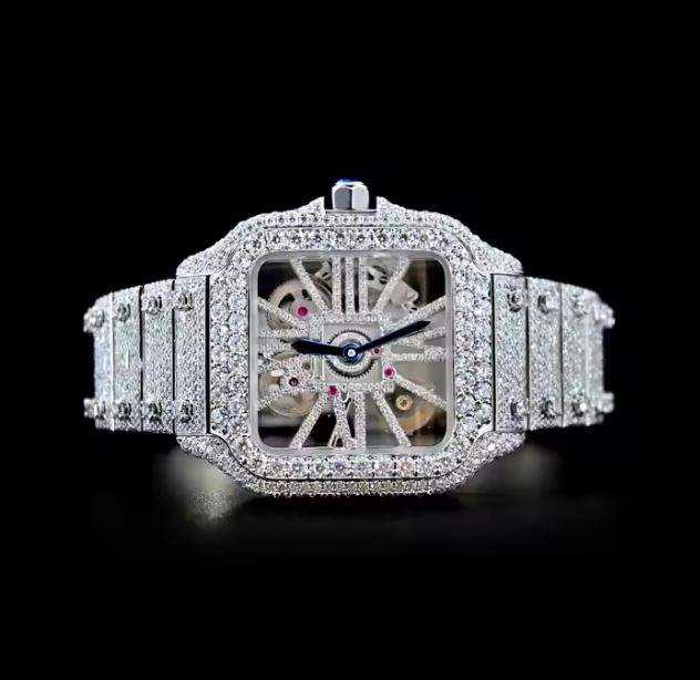 Luxurious Customized Iced Out Hip Hop Stainless Steel Square Skeleton Dial Moissanite Diamond Studded Watch For Men and Women
