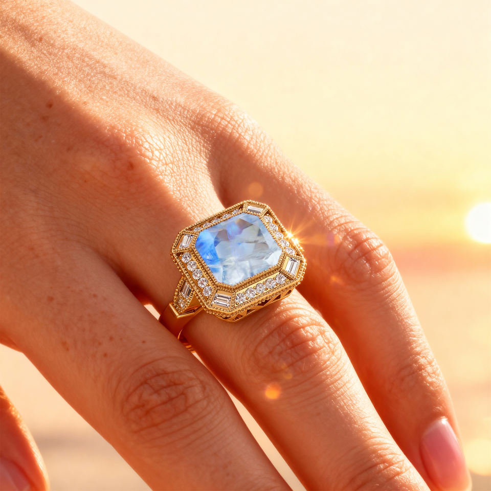 Luxurious Design Natural Rainbow Moonstone Gemstone Dainty Rings 18k Solid Gold Rhodium Plated Classic Wedding Real White