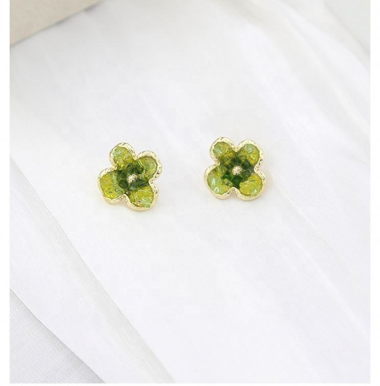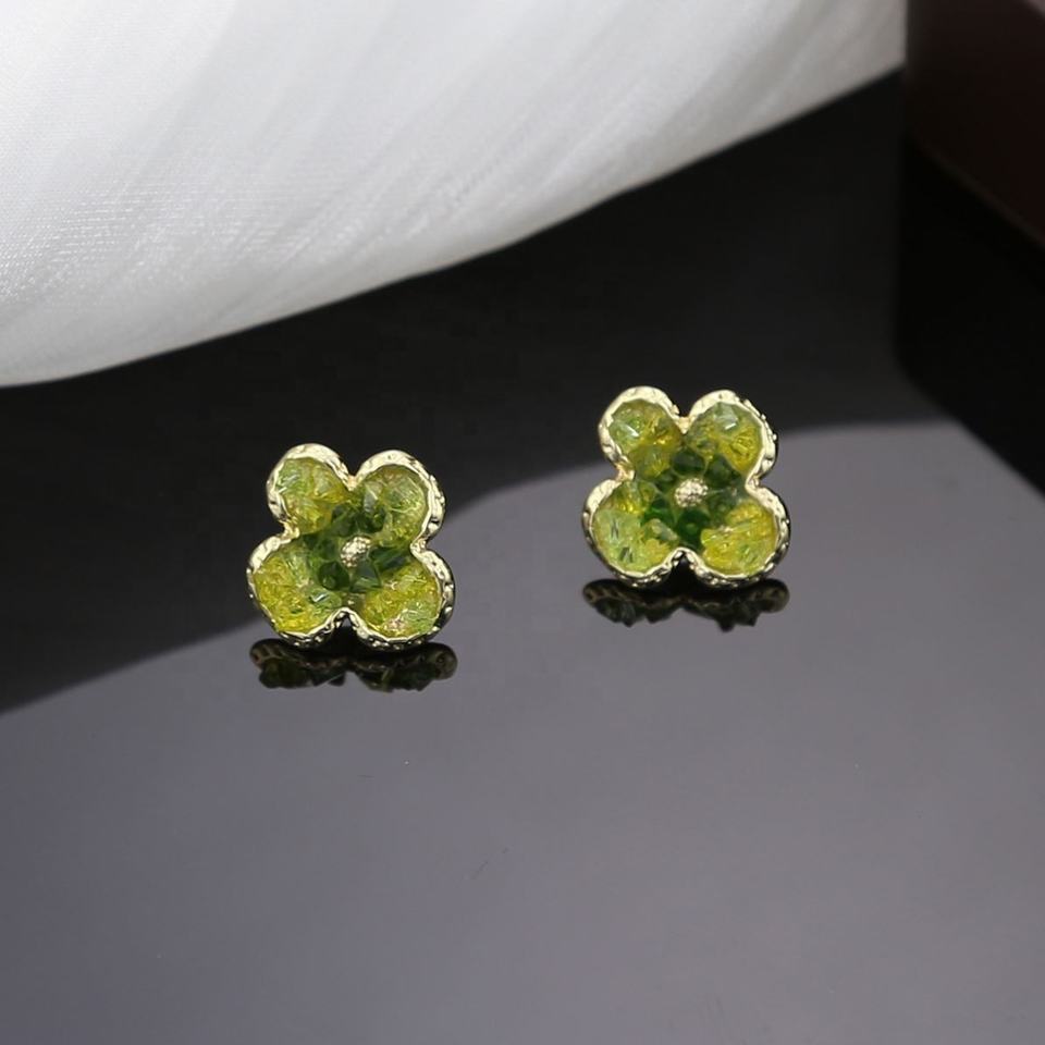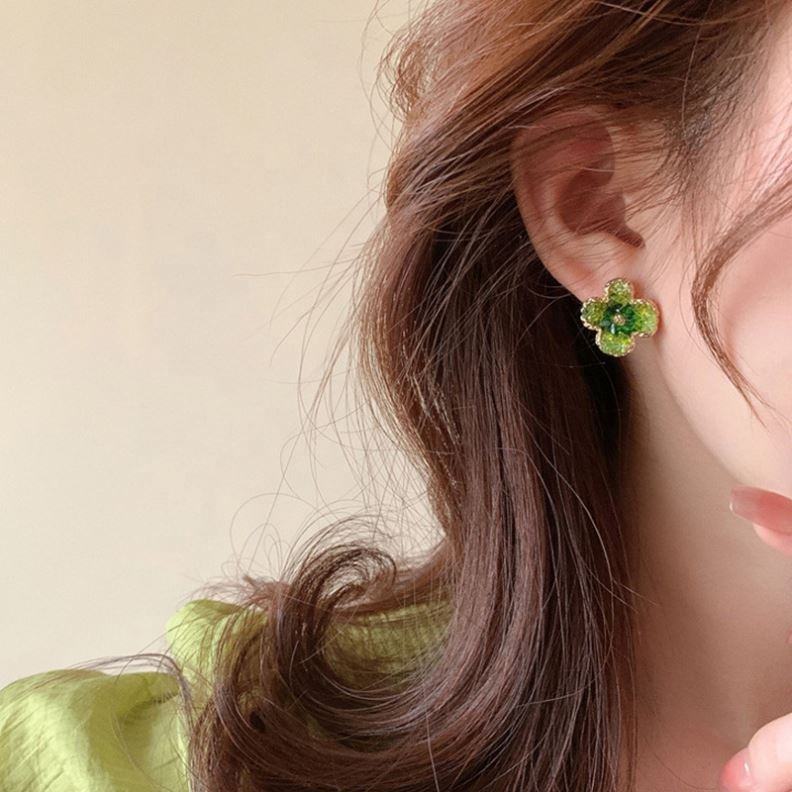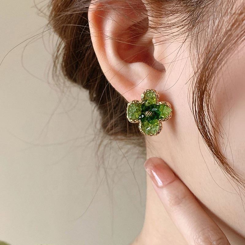 Luxurious Green Camellia Crystal Stud Earrings Versatile High-End Design with Zircon for Gift