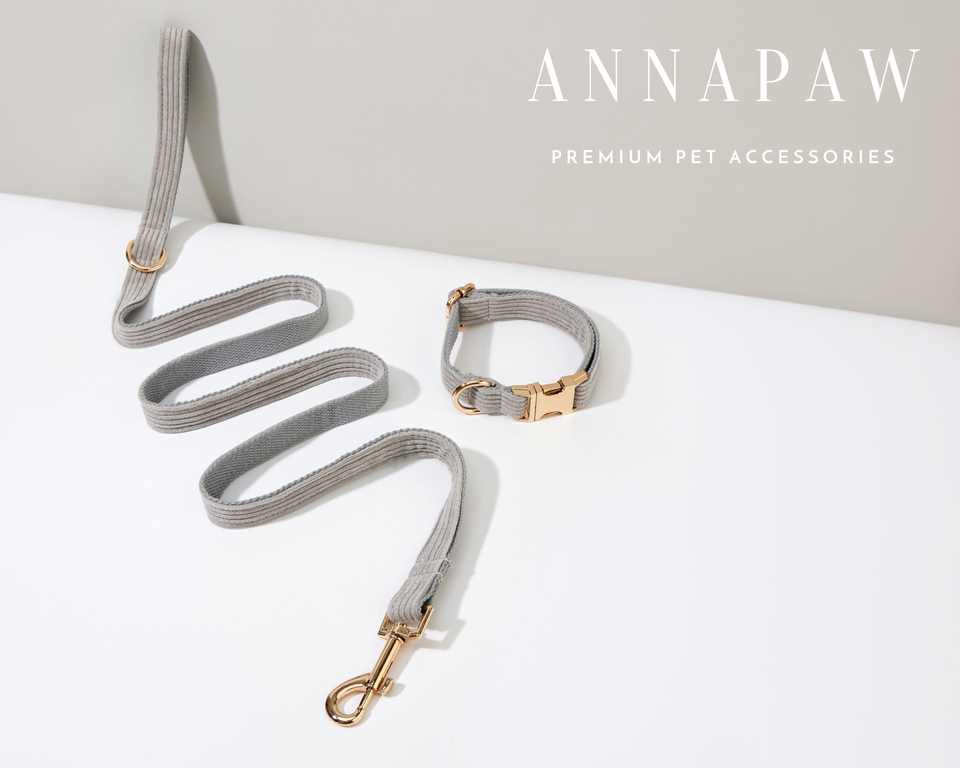 Luxurious Grey Corduroy Puppy Set Handmade Wedding Gift with Personalized Dog Collar Leash & Bowtie