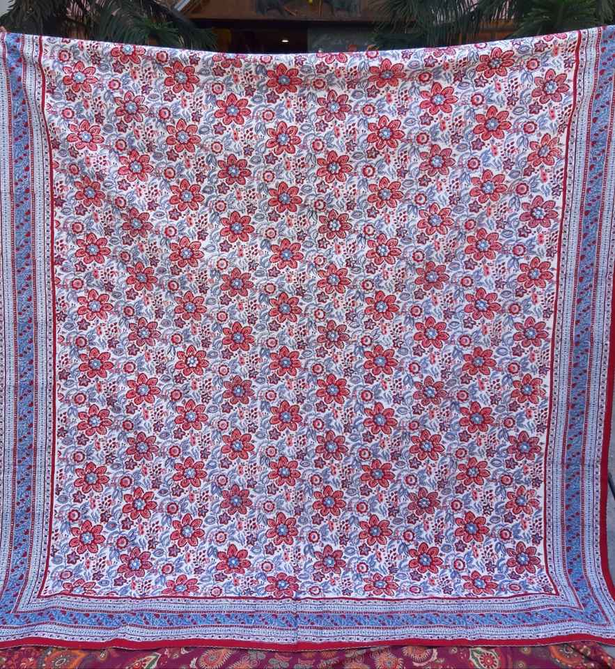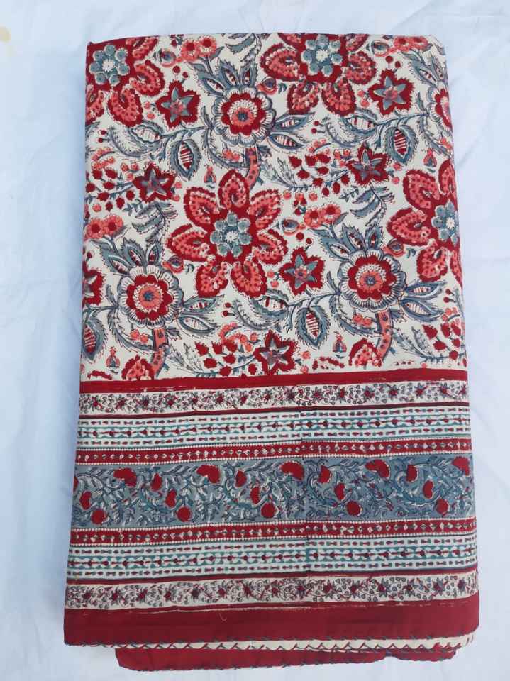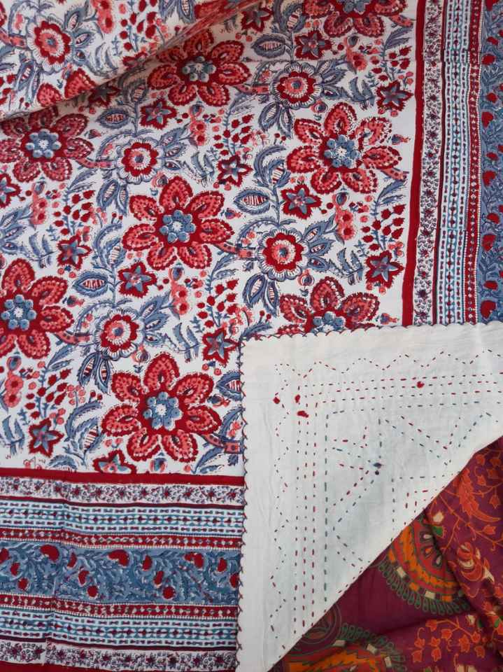 Cotton Fabric Hand Embroidered Floral Block Printed Bed Cover