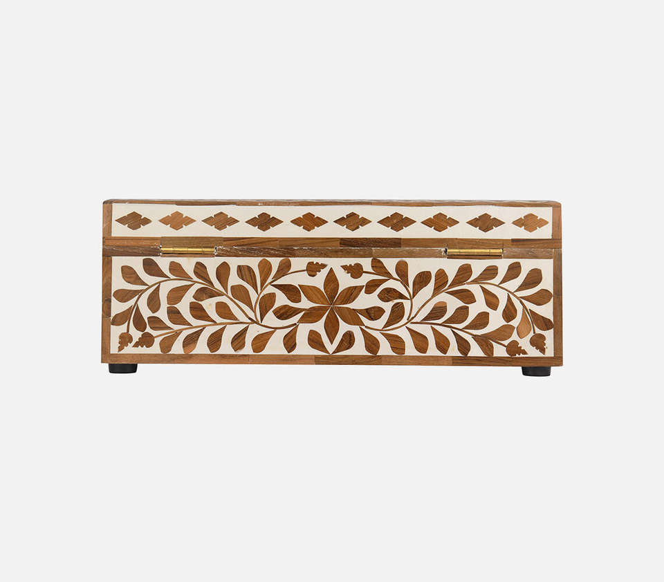 Luxurious Handcrafted Bone Inlay Decorative Box Featuring Elegant Brown Floral Leaf Pattern Rectangular Wooden Jewelry Keepsak