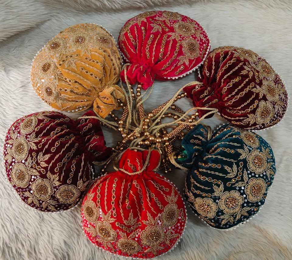 Luxurious Handcrafted Velvet Potli Pouch Set with Rich Zari Embroidery Pearl Bead Tassels Traditional Indian Festive Gift Bags