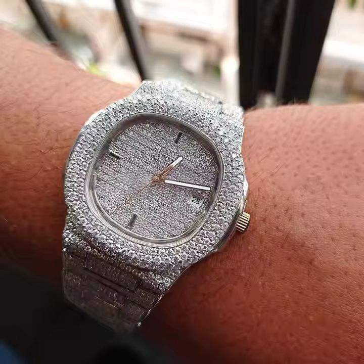 Luxurious White Gold Diamond Watch Handcrafted Analog Baguette Studded Glass New Arrival Iced Fashion Quartz Movement Band
