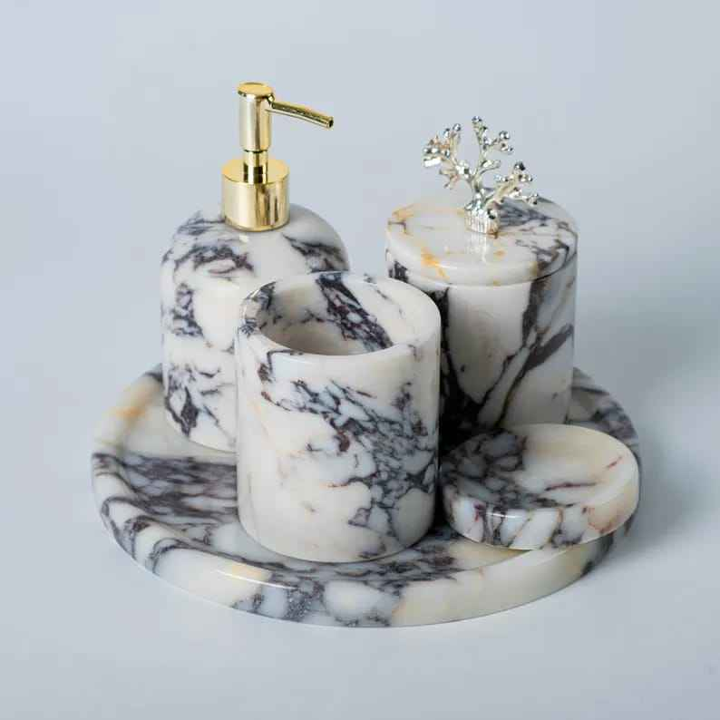Luxurious Marble Look Resin Waterproof Durable 4-Piece Bathroom Accessory Set Dispenser Toothbrush Holder Tray Soap Dish MN