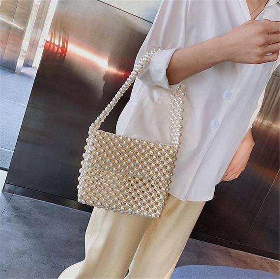 Luxurious Rectangle Pearl Handbag, Handmade Pearl Bags, Beaded Bucket Bags
