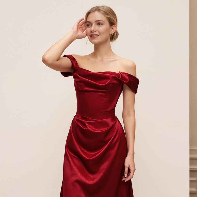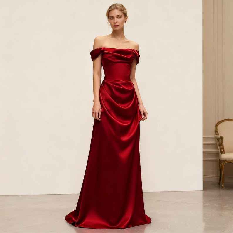 Luxurious Red Satin Prom Dress Off Shoulder Ball Gown Elegant Red Satin Maxi Evening Dress Formal Wedding Party Gown
