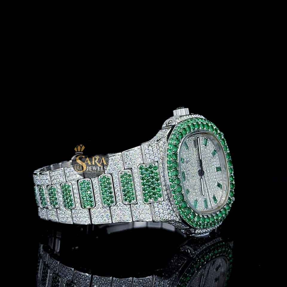 Luxurious Top Timepiece Watch Emerald Green Diamond Studded Hip Hop Style Mechanical Movement 18mm Band Width Antique Dial Glass
