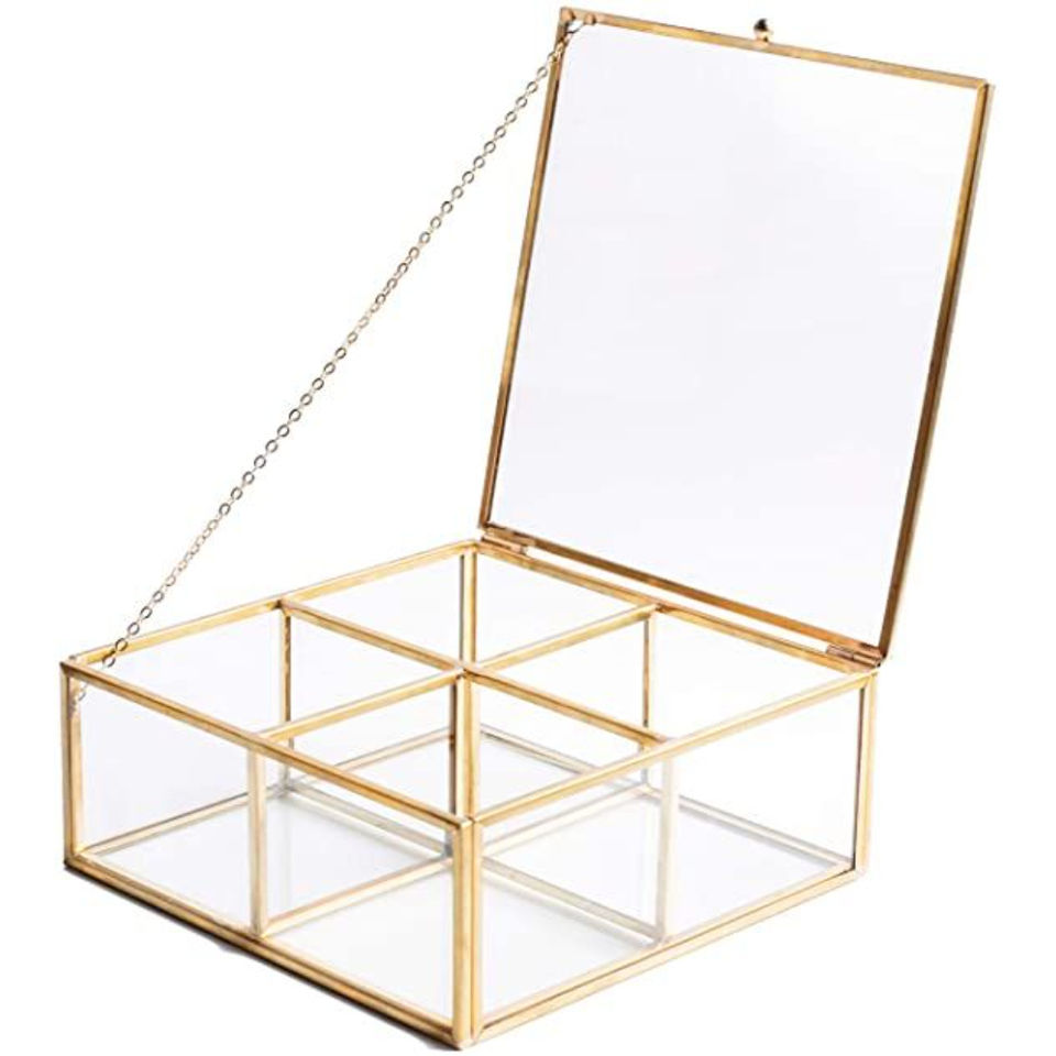 Luxurious Vintage Hexagonal Glass Jewelry Box Handmade Gold Metal Brass Mirrored Organizer Display Case For Home Decor