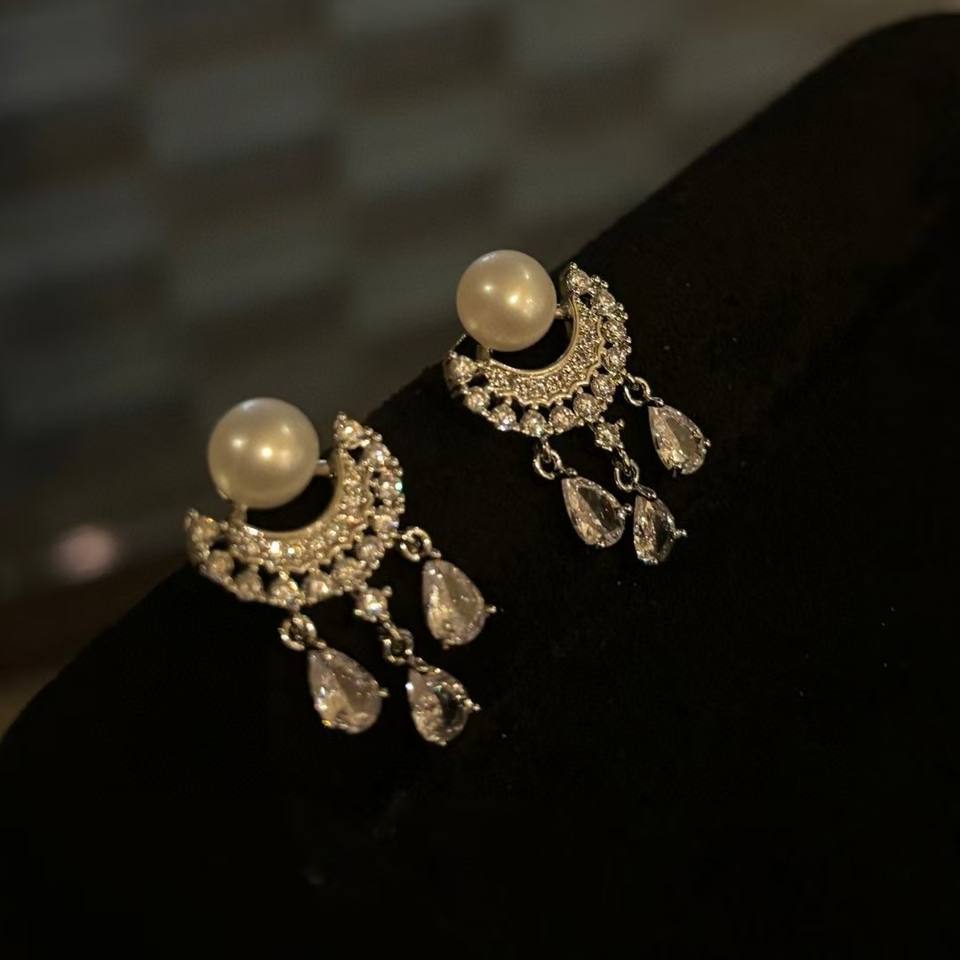 Luxurious Women's Crystal Earrings New Korean Style Diamond Studded White Pearl with Tassel Water Droplet Design
