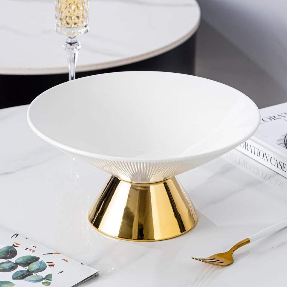 Luxury 10.5'' Ceramic Finish Fruit Bowl with Gold Metal Base | Modern Table Centerpiece Bowl for Home Hotel Decor