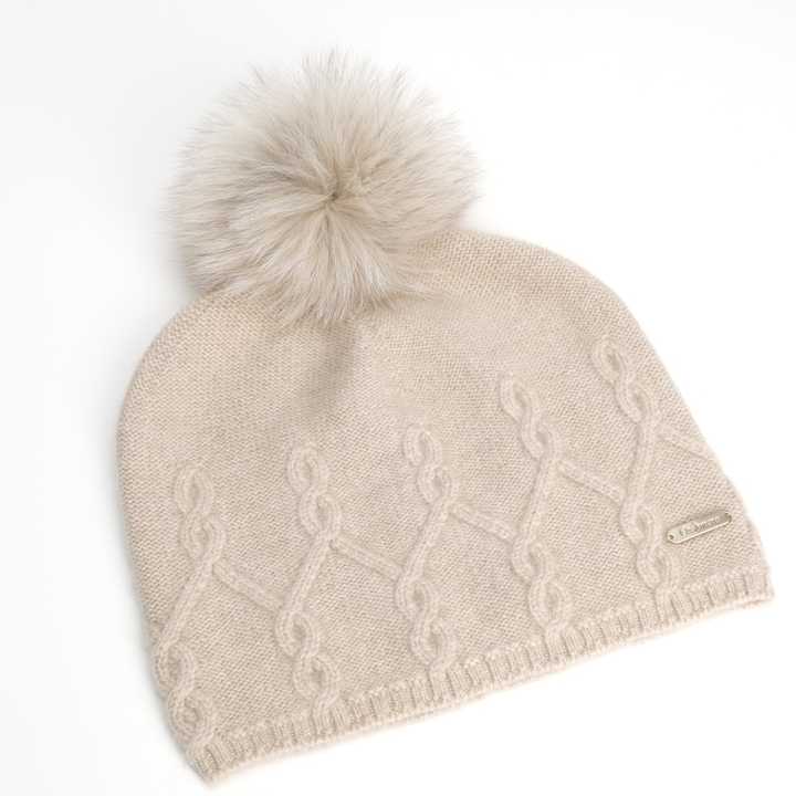Luxury 100% Pure Mongolian Cashmere Beanie Organic Beige Cable-Knit Design with Pom-Pom Very Warm Winter Hat