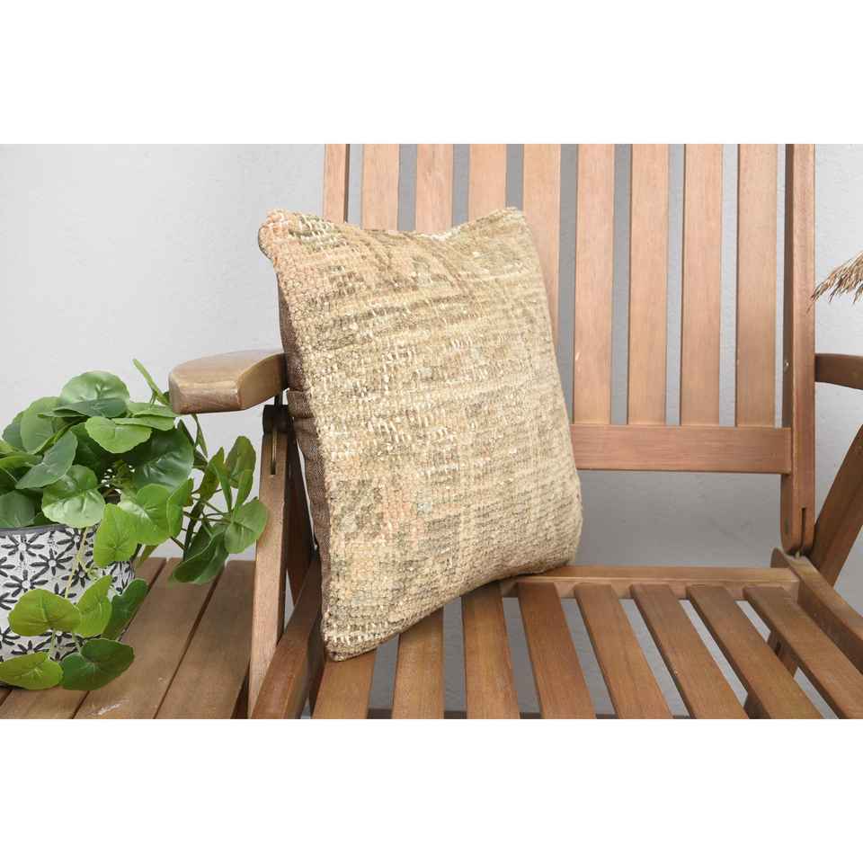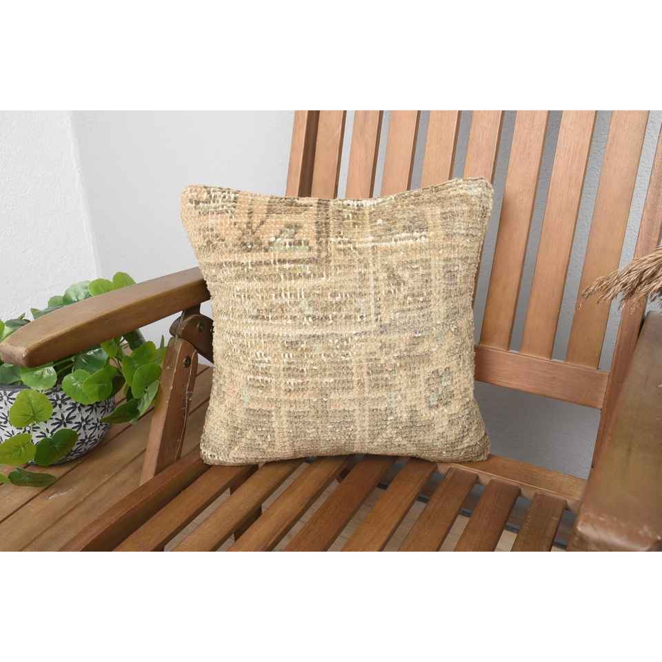 Luxury 14x14 Beige Wool Kantha Patchwork Pillow Woven with Vintage Fluffy Embroidered Print Design for Sofa Bedding