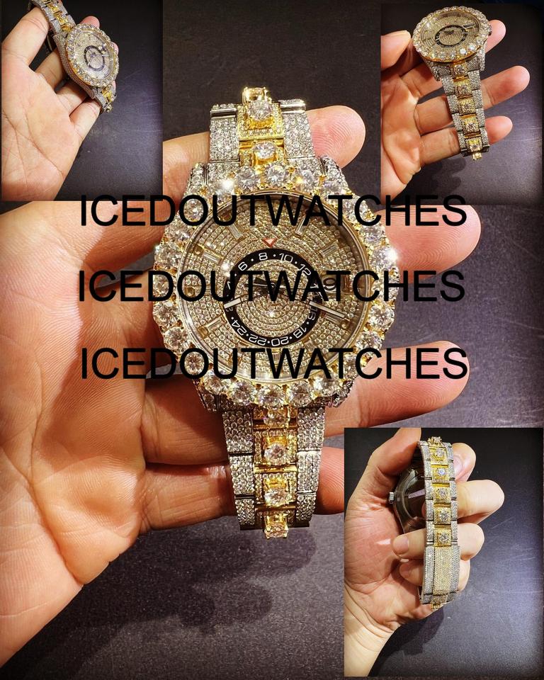 Luxury 18K Gold Plated Stainless Steel Full Diamond Quartz Wrist Watch Shiny Hip Hop Design Case 20mm Width Iced Men's 10 Bar