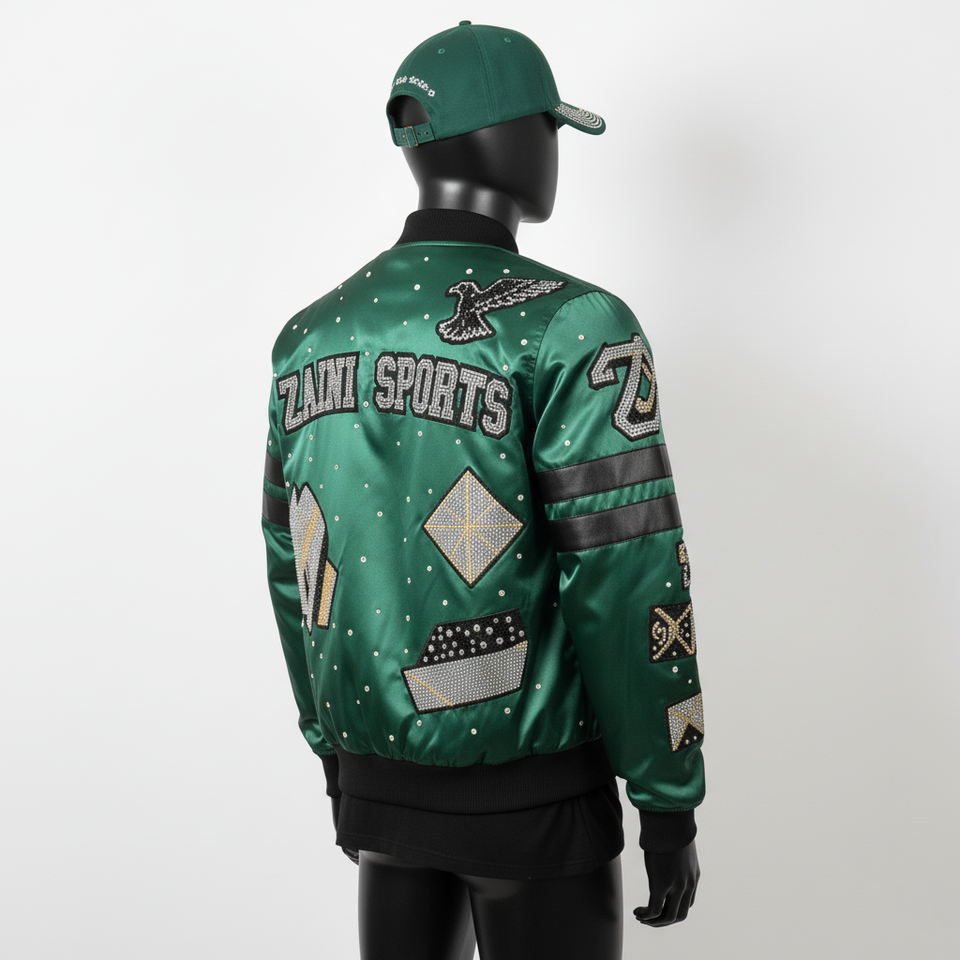 Luxury 250GSM Green Satin Bomber Jacket Premium Smooth Finish with Rhinestone Custom Logo and Embroidery Satin Jacket For Men