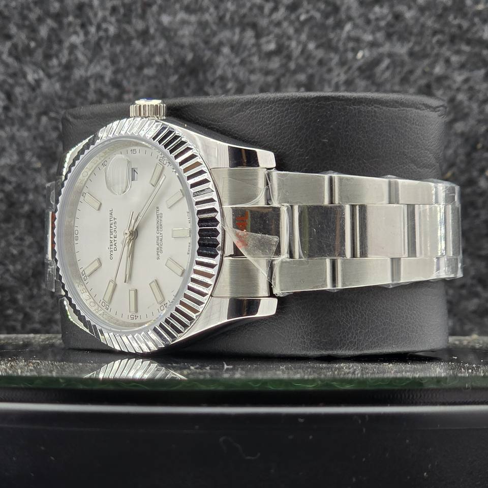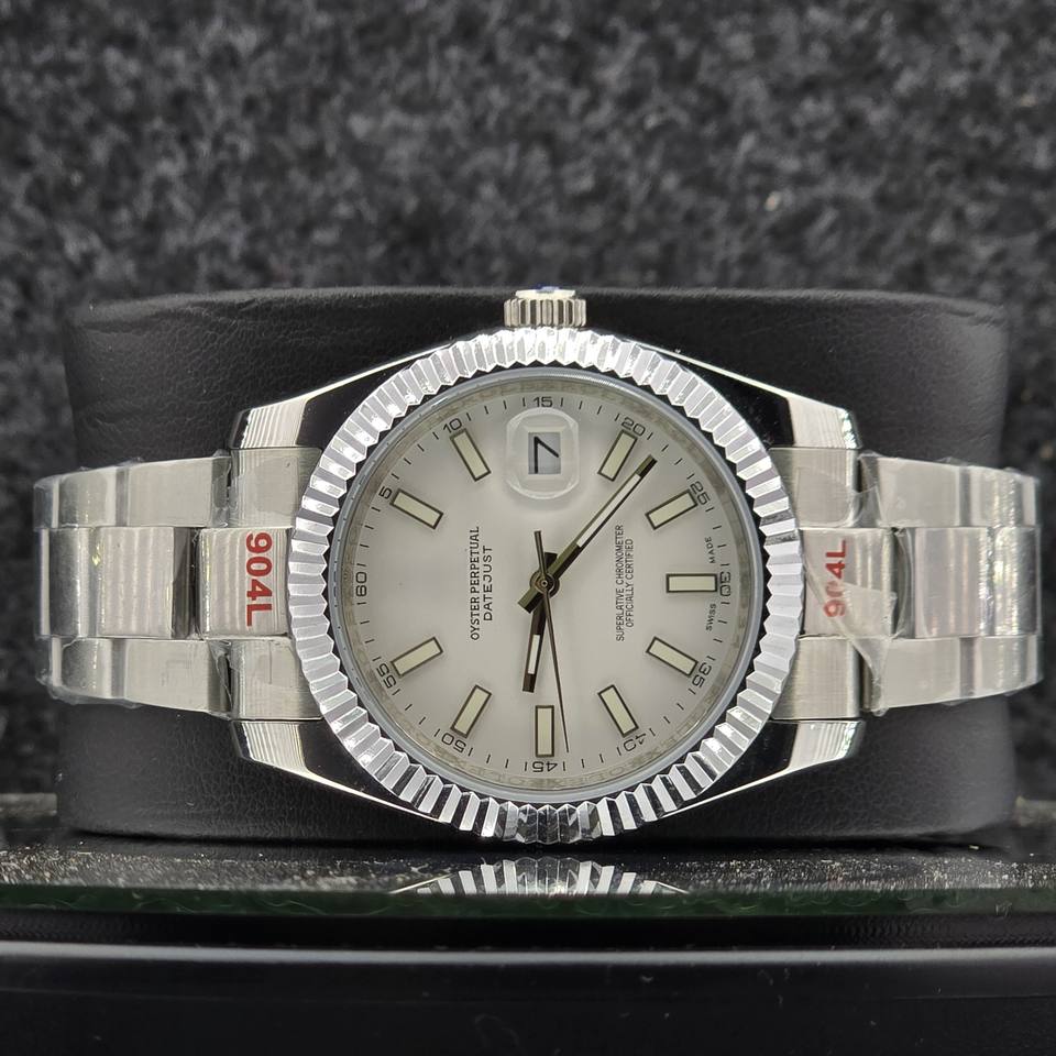 Luxury 41mm Men's Watch Stainless Steel Automatic Mechanical Style White Index Dial Fluted Bezel Business Wristwatch