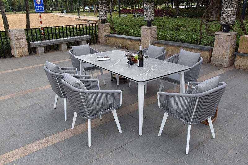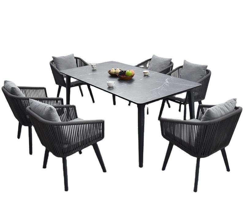 Luxury Modern 6-Piece Outdoor Dining Set Table Rope Woven Chairs Weather Resistant Hotel Park Patio Garden Terrace Furniture