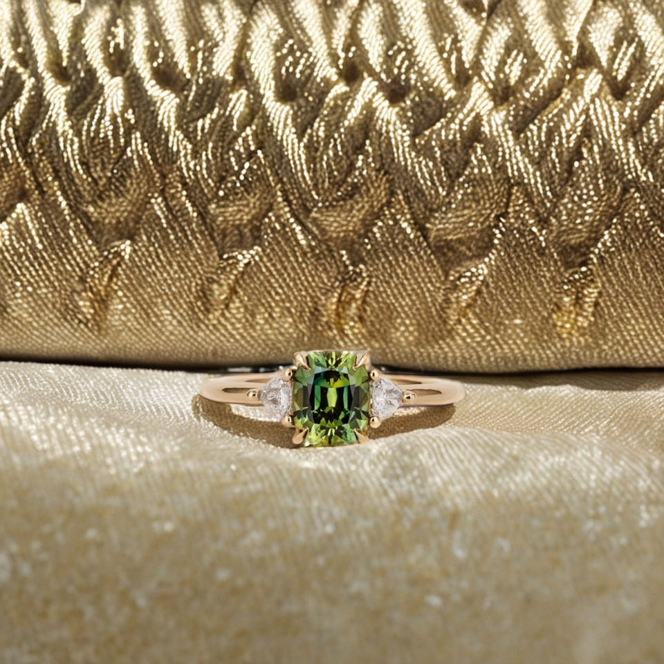 Luxury 925 Sterling Sliver Green Parti Sapphire Moissanite Three Stone Engagement Ring With Trillin cut Side Diamond Jewelry