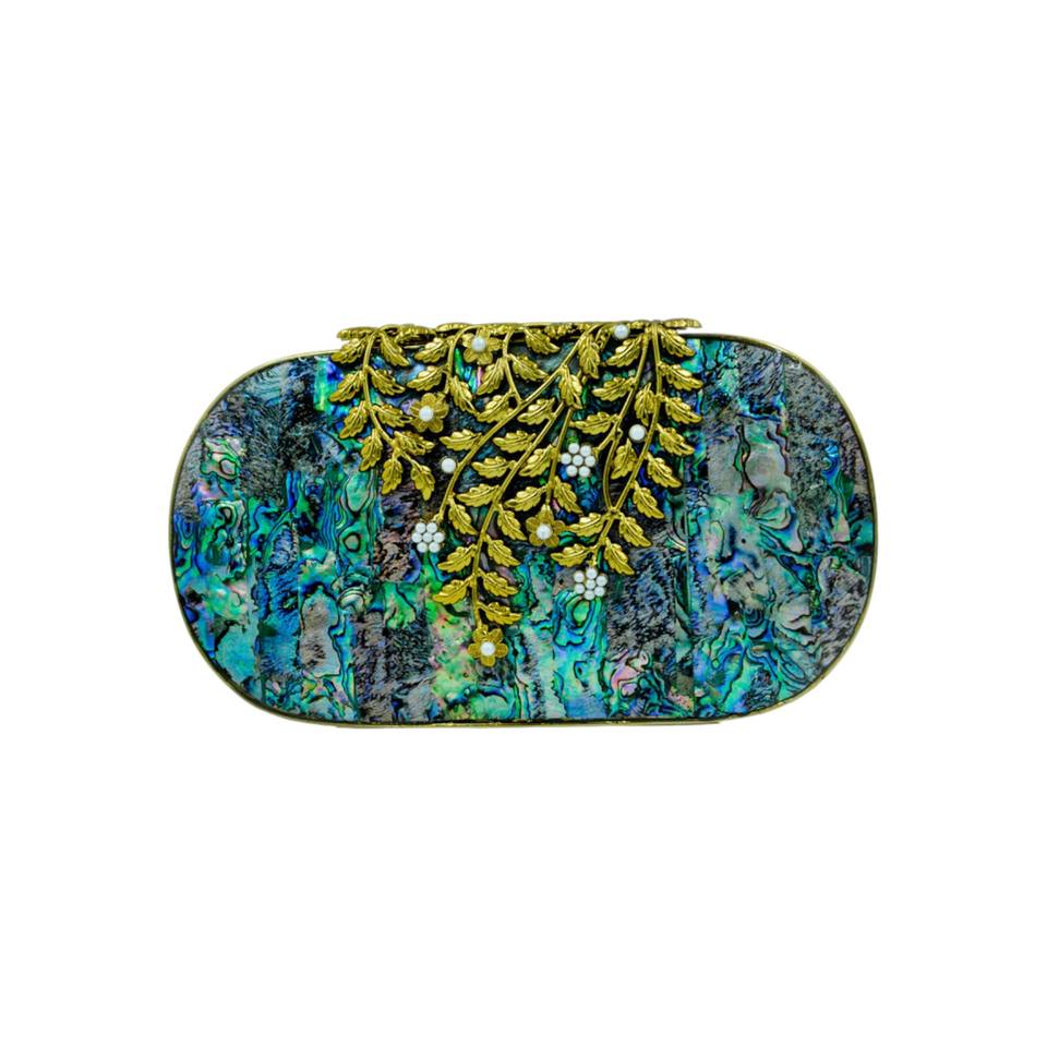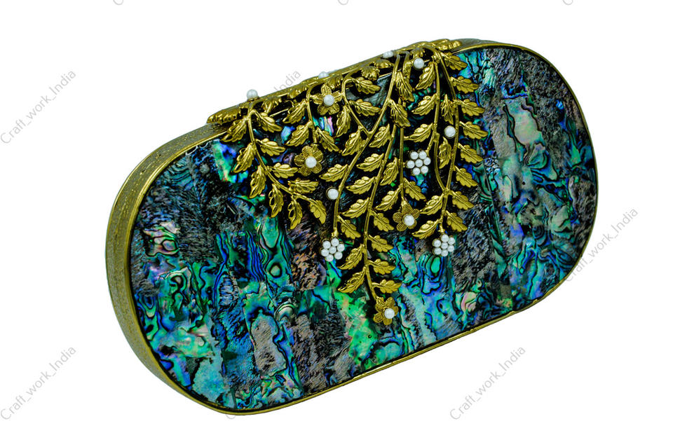 Luxury Abalone Shell Clutch with Gold Leaf Vine Work Handmade Designer Evening Bag for Bridal Wedding Party Wear