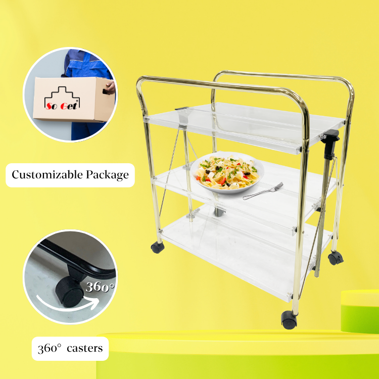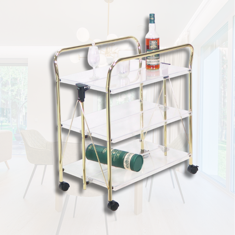 Luxury Modern Acrylic Foldable Food Trolley with Golden Electroplated Handles for Dining Restaurants and Hotel Kitchens
