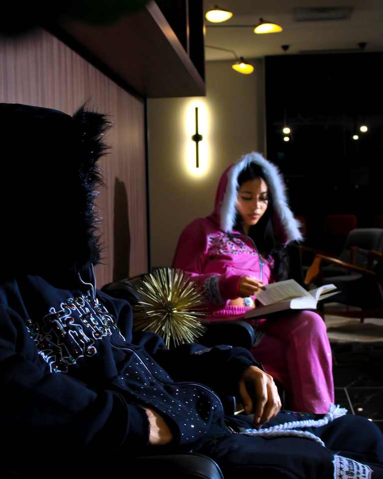 Luxury Adult 2-Piece Tracksuit Set Men and Women Sun Faded Screen Print Rhinestone Hoodie and Sweatpants for Winter
