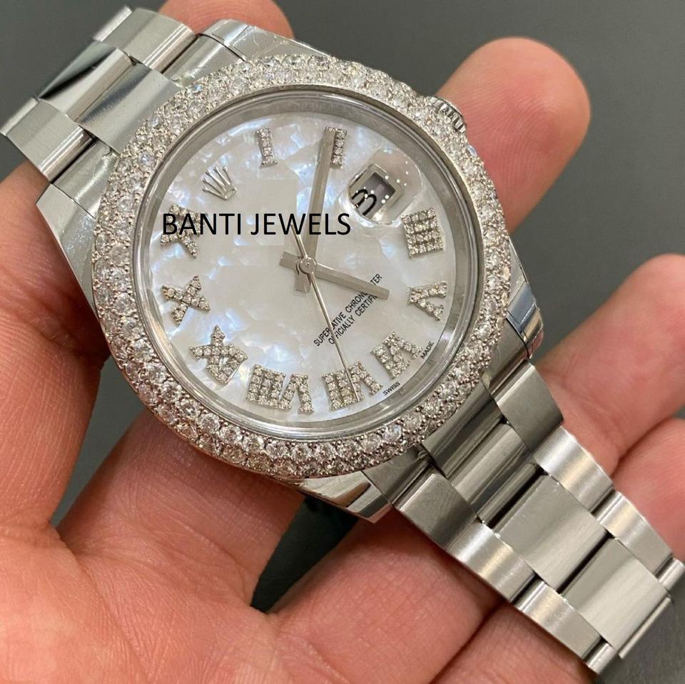 Luxury Antique Iced Moissanite Watch Stainless Steel Bezel Mother Pearl Dial Glass 20mm Band Dual Movement Eco-Friendly