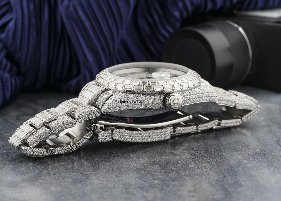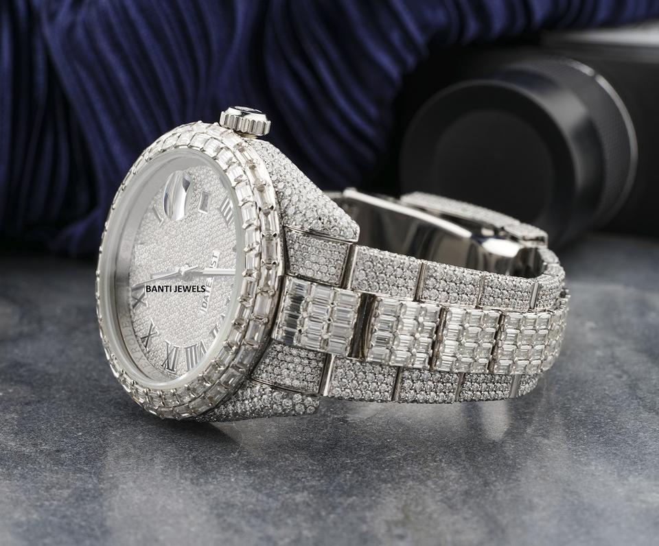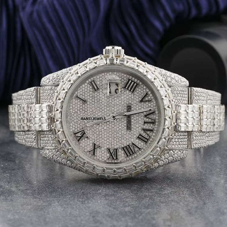 Luxury Antique Iced Out Moissanite ETA Dual Movement Watch VVS1 Full Diamond Hip Hop Stainless Steel Glass Dial 20mm Band