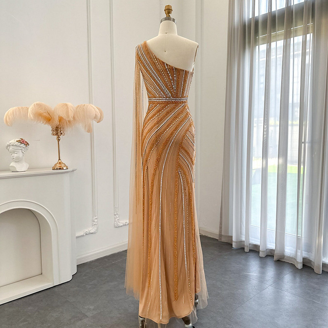 Luxury Beaded Dubai Gold A-Line Plus Size Floor-Length Evening Dress Cape Sleeve Long Elegant Women Wedding Formal Beaded